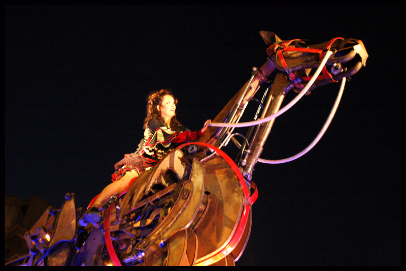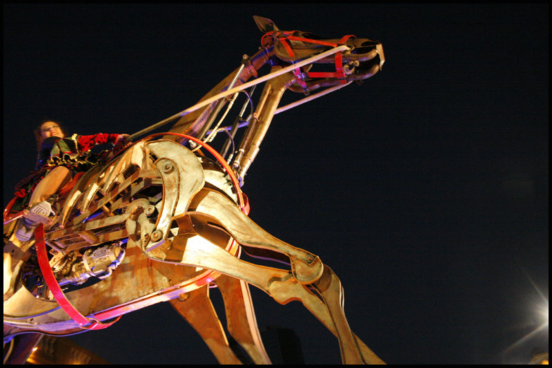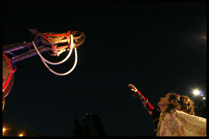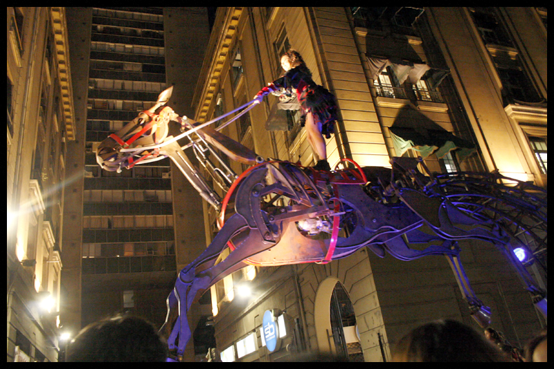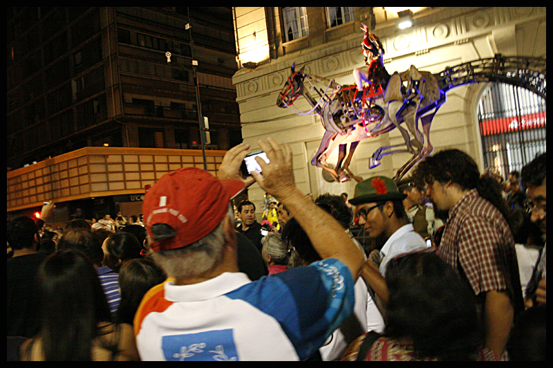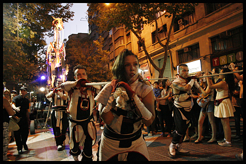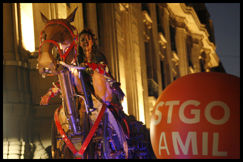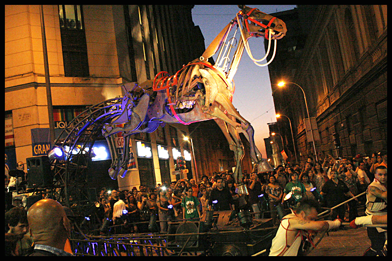 Desde huérfanos a catedral recorrió otro de los espectáculos del festival de Santiago a Mil. «El caballo de hierro» avanzó por la ciudad lentamente acompañado de melodías electrificantes y una compañía de teatro que a paso que daba, trataba de llevarlo a su salvación y liberación. Un trabajo motor finamente preparado y que cautivó entre los edificios a los espectadores y a las personas que coincidentemente caminaban por ahí. La compañía de teatro Antigua i Barbuda fue la responsable de este maravilloso evento que entre magia y sueños logró iluminar la noche.