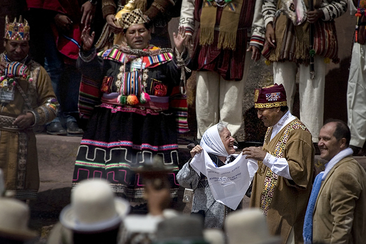 El presidente vestía una túnica de vicuña bordada en plata y oro, la pechera ritual y el gorro de cuatro puntas, pantalón de lana tejida y sandalias. Tras casi una hora de ceremonia, recibió el bastón de mando.