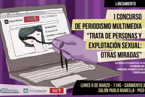 Con motivo del Día Internacional por los Derechos de la Mujer -que se celebra el 8 de marzo- el Ministerio de Justicia y Derechos Humanos de la Nación presenta el Concurso de Periodismo Multimedia “Trata de personas y explotación sexual: Otras miradas”. El acto de lanzamiento será el próximo lunes 9 de marzo a las 11 en el salón Pablo Ramella, de la sede del Ministerio (Sarmiento 329). Estará encabezado por el secretario de Justicia de la Nación, Julián Álvarez, y la subsecretaria de Acceso a la Justicia, María Florencia Carignano, y contará con la participación de funcionarios e integrantes del jurado que elegirá a los ganadores.