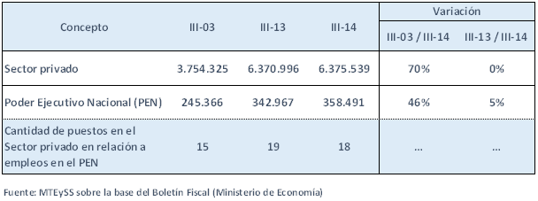 Pero lo más importante aún es que a pesar de las alarmas que dispara habitualmente este medio de comunicación sobre la expansión del empleo público desde el año 2003, la participación del mismo en el total del empleo asalariado registrado no sólo no creció exponencialmente, sino que cayó. Para probar esta afirmación se señala que en 2003 había 15 puestos de trabajo en la actividad privada por cada empleo en el PEN. Once años después, en 2014, se contabilizan más empleos del sector privado por puesto del ámbito público: 18 empleos privados por cada empleo público en el Poder Ejecutivo Nacional.