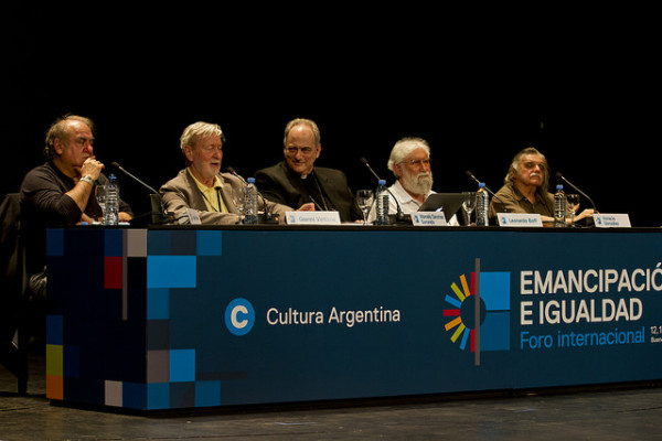 El pensamiento religioso y sus implicancias en las tradiciones emancipatorias fue el eje de la discusión que sostuvieron, en la tarde del viernes 13 de marzo, el teólogo y ecologista brasileño Leonardo Boff, el filósofo y político italiano Gianni Vattimo, el sacerdote argentino Marcelo Sánchez Sorondo, y el sociólogo y escritor Horacio González, durante de la segunda jornada del Foro Internacional por la Emancipación y la Igualdad, que concluye mañana en el Teatro Nacional Cervantes.