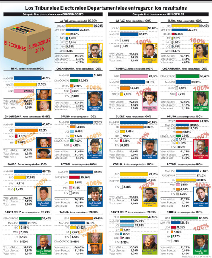 Según el recuento de actas en los TED, el MAS ganó en 225 de las 339 alcaldías del país, entre ellas dos capitales de departamento: Sucre y Potosí. Es decir, toma el control del 66% de los municipios.