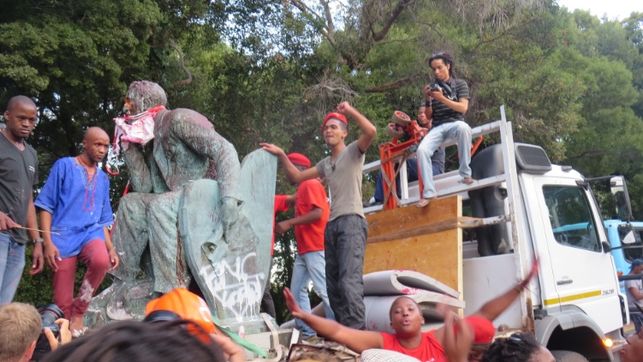 Cuando la estatua es colocada en la parte trasera del camión, jóvenes negros, blancos, indios y mulatos aplauden y se abrazan. «¡Victoria histórica!» —dicen unos— «no buscamos venganza, pero no olvidamos», grita otro. Varios estudiantes se suben al camión. Cuelgan una soga al cuello de C. Rhodes, le arrojan pintura roja y blanca, y golpean con palos la estatua metálica.