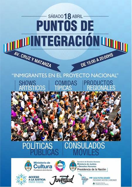 La Secretaría de Derechos Humanos de la Nación invita al festival “Puntos de Integración”, un espacio de encuentro de las comunidades inmigrantes con el Estado nacional, organizaciones políticas y sociales y la sociedad en general, con el objetivo de que se interrelacionen para conquistar nuevos derechos y difundir sus culturas.