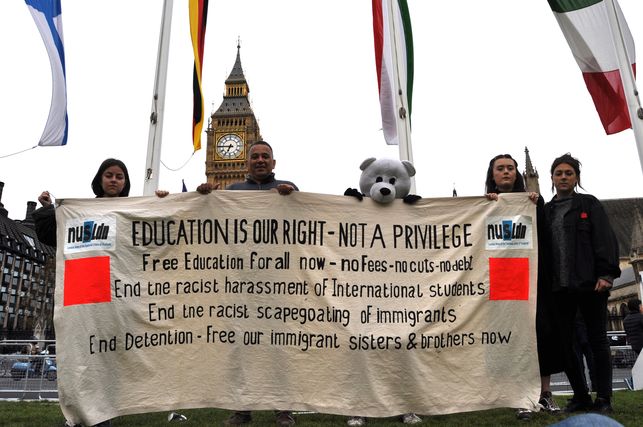 Fallows, Grace y Jasmine son estudiantes de la Universidad de Artes de Londres y forman parte del Sindicato Nacional de Estudiantes. Con su pancarta “a favor de la educación gratuita, igualdad real para todos, contra el racismo y la austeridad” se han unido a la protesta de Occupy Democracy. Este movimiento social lleva desde el 1 de mayo organizando diversas actividades y charlas frente a las Casas del Parlamento. Se quedará hasta el 10, aunque no están durmiendo en la plaza.