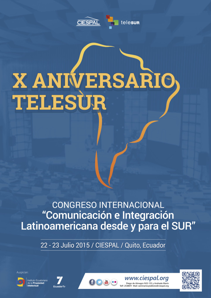 En el marco del 10 Aniversario de creación de TeleSUR, el Centro Internacional de Estudios Superiores de Comunicación para América Latina (CIESPAL) organiza el Congreso Internacional «Comunicación e Integración Latinoamericana desde y para el Sur», que tendrá lugar el 22 y 23 de julio de 2015, en el Auditorio de CIESPAL, Quito, Ecuador.