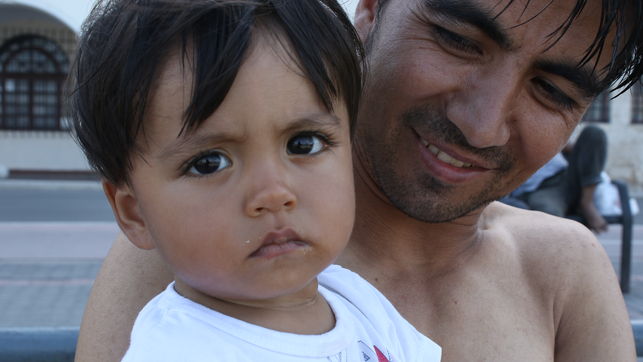 Danial se apoya en el murete del paseo marítimo observando el mar. Podría ser un turista, pero en vez de subir a un hotel, pasará la noche en la playa entre cartones. Es uno de los 3.000 refugiados e inmigrantes atrapados en la pequeña isla griega que se hacinan en cualquier rincón de la ciudad. Este hombre afgano llegó a la costa helena hace veinte días, junto a su mujer y a su hijo de un año, Saim, al que sostiene en sus brazos.