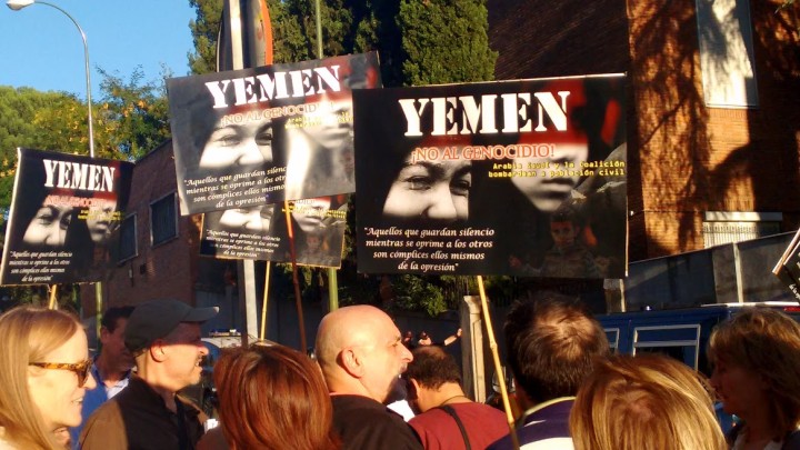 La Plataforma por Yemen, constituida en Madrid el 24 de julio, ha realizado este jueves 24 de septiembre, a las 18’30 horas, una concentración ante la Embajada de Arabia Saudí en Madrid para denunciar la guerra genocida que este país está manteniendo contra la República de Yemen, y en la que ya han muerto más de 4.000 personas, además de matar o herir a más de 1.000 niños.