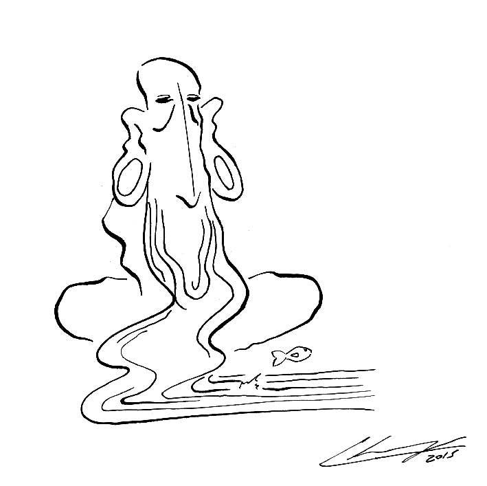 Estuvo así un tiempo, simplemente siendo río, cuando empezó a sentirse acongojado. Sin saber de dónde venía tanta tristeza, soltó una lágrima que brilló al sol un instante antes de caer al agua y, con un “plin”, transformarse en un pececito dorado.