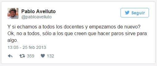 Pues capaz no seamos los más ilustrados para catalogar al “nuevo” equipo económico instituido, que por algún motivo nos resulta conocido. Quizá, de hecho, no seamos los más técnicos a la hora de cuestionar a Patricia Bullrich o su idoneidad, tan sólo porque nos parece la antinomia de cualquier seguridad. Y tal vez, todavía nos falte estudiar otro tanto, para que nos inviten a disertar acerca del ex gerente de Monsanto, que manejará un Ministerio de Agricultura. Ahora, a la hora de la cultura, no podemos callar que acaban de anunciar a Pablo Avelluto como un ser impoluto, ante tantos oídos indiferentes, como si no fuera el tipo que propuso “echar a todos los docentes”, el mismo que soñó “la muerte del peronismo” mediante el terrorismo de Estado, el mismo que se ilusionó con el IUNA cerrado; el mismo tipo que otrora reivindicó a la “Revolución Fusiladora”.