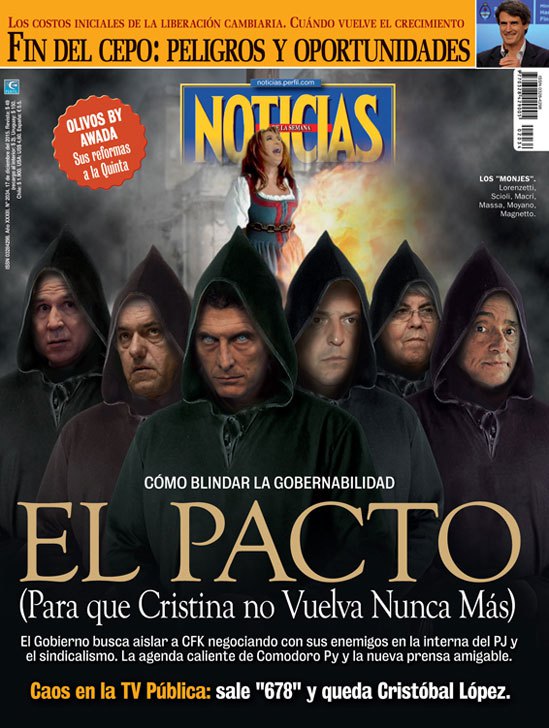 La revista noticias quema en la hoguera a Cristina Fernández de Kirchner. Es la imagen de la nueva tapa que no sorprende con su insistente misoginia y sus cátedras de violencia simbólica. Por delante de la imagen de la ex Presidenta, se puede ver un grupo de hombres encapuchados, los perpetradores del crimen, encargados de “cómo blindar la gobernabilidad”. Encabeza el actual Presidente Maurizio Macri, con unos resaltados diabólicos ojos celestes, lo preceden Massa y Scioli, finalmente se puede distinguir a Lorenzetti, Moyano y Magnetto.