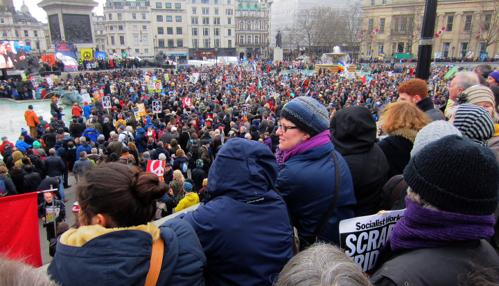 Chair: Kate Hudson – Secretario General de la Campaña por el Desarme Nuclear, (CND), Roger McKenzie – Secretario General Adjunto, UNISON, Sam Fairbairn – Secretario Nacional de la Asamblea Popular contra la austeridad, Vanessa Redgrave – estrella de teatro y cine, el Obispo Stephen Cottrell (Obispo anglicano de Chelmsford) habló, acompañado por líderes de la fe, Obispo Thomas McMahon (RC), Rachel Lampard – Iglesia Metodista, Paul Parker – cuáqueros, Mohammed Kozbar – Asociación Musulmana de Gran Bretaña, Rev. Nagase – Comunidad Budista (uno de los líderes de la fe dio lectura a un comunicado de múltiples fe, después de que el Obispo Stephen hubiera hablado), Leanne Wood – líder del Plaid Cymru, el Partido de Gales, Caroline Lucas MP, Partido Verde, Nicola Sturgeon, Primer Ministro de Escocia, Mark Serwotka, Secretario general del sindicato de Servicios Públicos y Comerciales, Raghad Tikriti – Asociación Musulmana de Gran Bretaña, Lindsey German – convocante, Coalición Paremos las Guerras, Bruce Kent – Vicepresidente, CND, Danielle Tiplady – Estudiante de enfermería, Sharon Dolev – Movimiento de Desarme israelí, Shakira Martin – Vicepresidente NUS (educación superior), Rev. Giles Fraser – sacerdote, escritor y locutor, Christine Blower – Secretario General de la Unión Nacional de Maestros, Francesca Martinez – comediante, Tariq Ali – escritor y activista contra la guerra, John Boulton – Veteranos por la Paz, Reiner Braun – Oficina Internacional de Paz, Jeremy Corbyn – Líder del Partido Laborista.