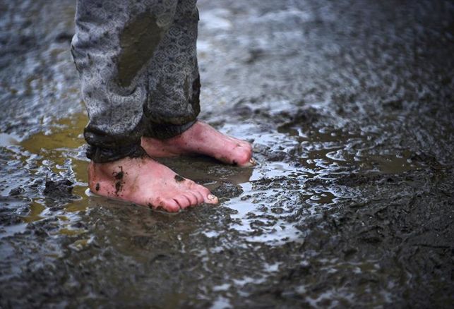 Los niños corretean de un lado a otro, cansados, hambrientos y sucios. Están rodeados de tiendas de campaña empapadas por la lluvia. Las mujeres permanecen dentro de las tiendas mientras que los hombres se sientan en la entrada e intentan infructuosamente hacer fuego con trozos de madera mojada.