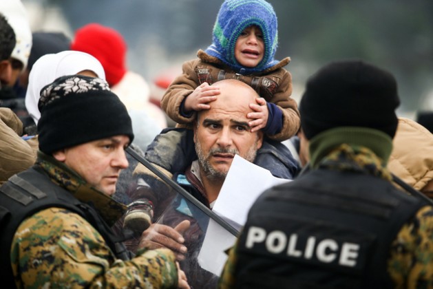 Un padre desesperado, con su hijo llorando sobre los hombros, que sobreviven en condiciones insoportables en el campamento de Idomeni, en la frontera de Grecia con Macedonia, trata sin éxito de que gendarmes de ese país le permitan el paso para adentrarse en Europa.