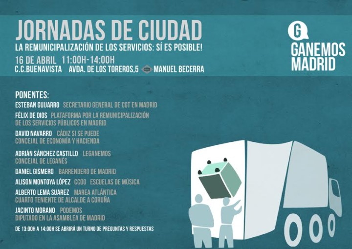 Ganemos Madrid, plataforma adherida a Ahora Madrid, convoca una jornada de debate sobre remunicipalización de los servicios públicos a las 11 hs. del sábado 16 de abril en el Centro Cultural Buenavista (Av. de los Toreros 5), con motivo de la polémica surgida en torno a la recuperación por parte del Ayuntamiento de la gestión de la recogida de basuras.