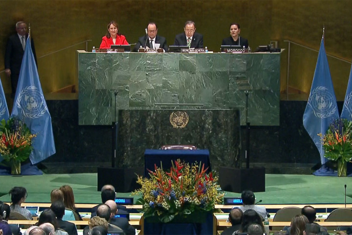 “En diciembre pasado en París, la comunidad internacional adoptó el primer acuerdo universal sobre el cambio climático. Cada país se comprometió a reducir sus emisiones y a reforzar su adaptación frente a los efectos potencialmente devastadores de los cambios climáticos”, declaró Ban Ki-moon en su discurso de apertura de la ceremonia de firma, en el recinto de la Asamblea General de las Naciones Unidas.