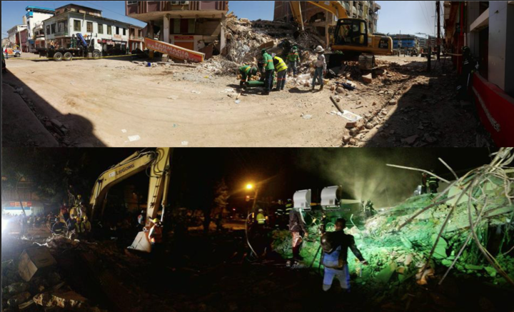 Las labores de rescate se hacían contra reloj, con la ayuda de bomberos de la ciudad de Quito y la maquinaria de la gobernación de Manabí, se dieron a la labor de buscar y rescatar sobrevivientes.
