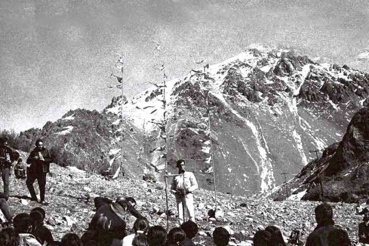 Era un día asoleado, llegamos en diversos vehículos y buses, estábamos expectantes en aquel paraje montañoso próximo a la ruta. Una sutil emoción se hace presente. Los mástiles con banderines naranja indicaban el lugar en que hablaría, nos distribuimos alrededor con tranquilidad; en ese silencio que solo la montaña y su magnificencia saben producir, con algún viento que hacia ondear los banderines. Era medio día.