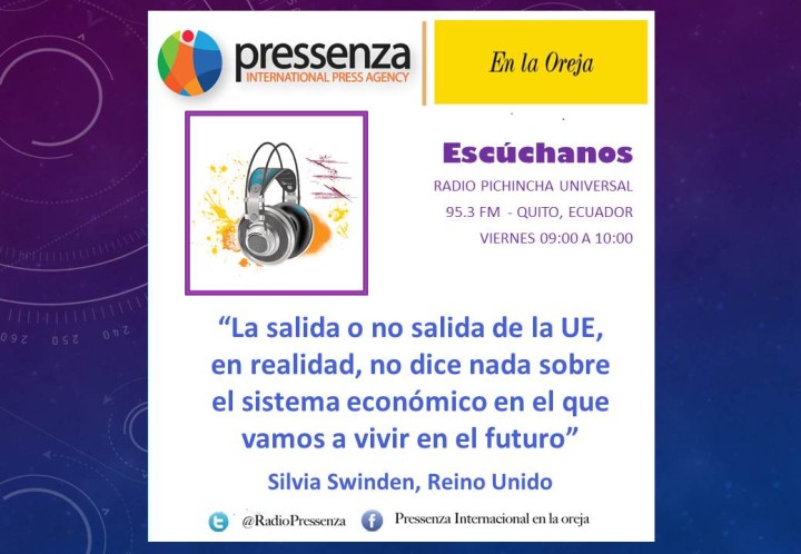 Pressenza Internacional En la Oreja se emite todos los viernes de 9 a 10 de la mañana por la radio pública ecuatoriana Pichincha Universal. Es un programa conducido por Nelsy Lizarazo, Tony Robinson y Mariano Quiroga. También participan de la producción Evelyn Jaramillo, Patricio, Santiago, Nicolás y Blanca Diego de Lola Mora Producciones.