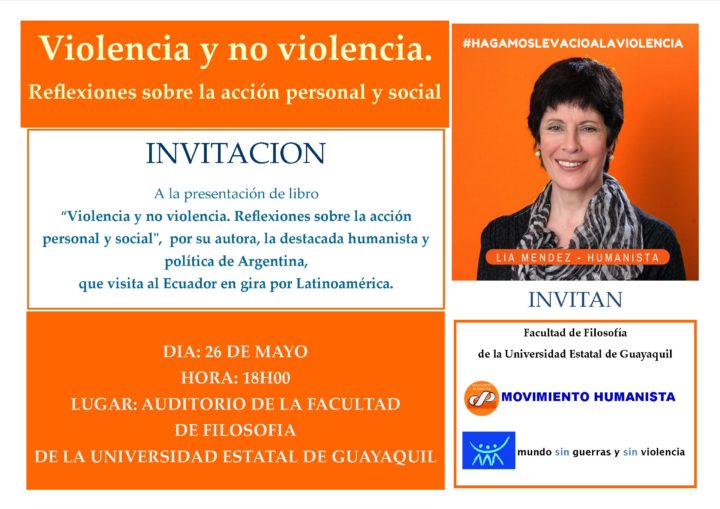 La destacada humanista y política argentina Lía Méndez, visitará la ciudad de Guayaquil, Ecuador, con motivo de la presentación de su nuevo libro “Violencia y o violencia. Reflexiones sobre la acción personal y social”. Lía Méndez es abogada mediadora de la Universidad de Buenos Aires, quien hasta el 2015 ocupó el cargo de Directora General de Relaciones Institucionales del Senado de la Nación Argentina (2011-2015), a la vez que Coordinó la Comisión de Paz y No violencia del Consejo de la Sociedad Civil de la Cancillería argentina (2012-2015).