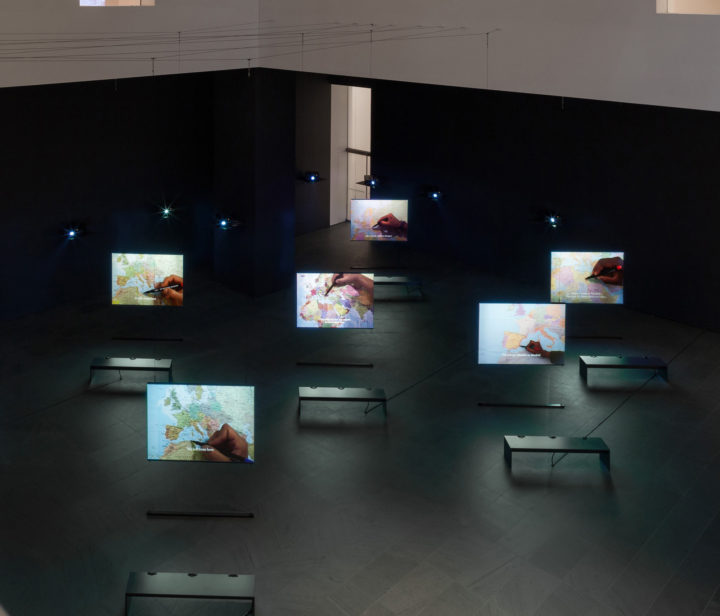 Hay ocho pantallas colgando en el espacio abierto del Marron Atrium. Cada uno de los videos muestra un mapa de una parte de Europa y África. Una mano con un lápiz traza la ruta de viaje de un refugiado. Sus voces narran el viaje en detalle… no ver ningún árbol…el calor…el tiempo que pasaron en el desierto o en automóviles…