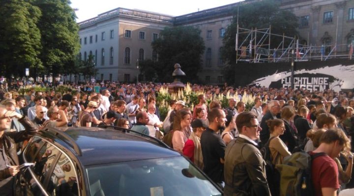Para incrementar la conciencia social con este tema, organizaron un evento para esa misma tarde, en el que se pudo ver al Teatro Gorki de Berlín decorado como un circo romano, en el que unos tigres se “comían” simbólicamente a un grupo de refugiados. Al parecer, 12 refugiados se ofrecieron como voluntarios para participar en esta protesta artística. Los tigres representaban “regalos” de Erdogan, como símbolo de sus políticas inhumanas y del trato sucio que hizo con la UE. Las autoridades locales de Berlín intentaron detener el evento, pero finalmente se llevó a cabo bajo observación policial, aunque ningún refugiado fue “devorado” por los tigres. Cerca de 300 personas participaron. Entre ellos había muchos jóvenes y miembros de la comunidad siria-árabe de Berlín. Se entrevistó a los padres y esposos de algunos de los refugiados que debían llegar anoche. La esposa e hija de uno de los entrevistados deberían haber llegado en el vuelo, que las habría sacado de lo que describen como una miserable situación de tránsito, que fue interrumpida en Turquía.
