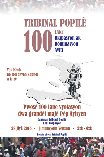 Diversas organizaciones sociales están planeando lanzar un “Tribunal popular” en Puerto Príncipe y otras ciudades, el 28 de julio de 2016, para hacer un juicio simbólico a 100 años de ocupación y de dominación de parte de los Estados Unidos y sus aliados, según aprendió AlterPresse a través de una nota de fecha 18 de julio de 2016.