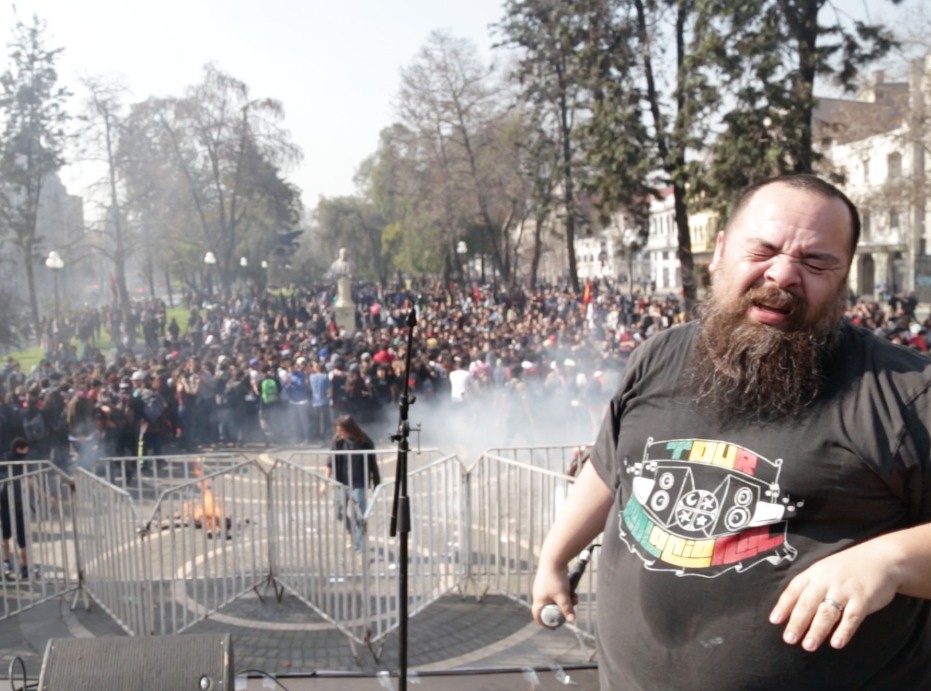 Parece ser el ojo del huracàn, ya que el escenario està rodeado de cientos de carabineros que persiguen a los estudiantes, lanzàndoles agua y gas lacrimógeno, mientras los estudiantes les responden lanzàndoles piedras y otros objetos. Motocicletas, carros armados, masas que corren, prensa que intenta objtener la foto perfecta. Y en el medio de ello, separado por un vallado, el escenario. Un evento cultural, autorizado por la administración municipal, donde los técnicos, los músicos y otros artistas realizan su trabajo en paz.