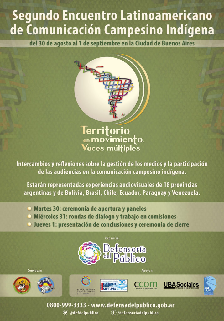 La Defensoría del Público de Servicios de Comunicación Audiovisual llevará a cabo el II Encuentro Latinoamericano de Comunicación Campesino Indígena: Territorio en movimiento. Voces múltiples, del 30 de agosto al 1 de septiembre en el Espacio Memoria y Derechos Humanos, Av del Libertador 8151, Ciudad de Buenos Aires.
