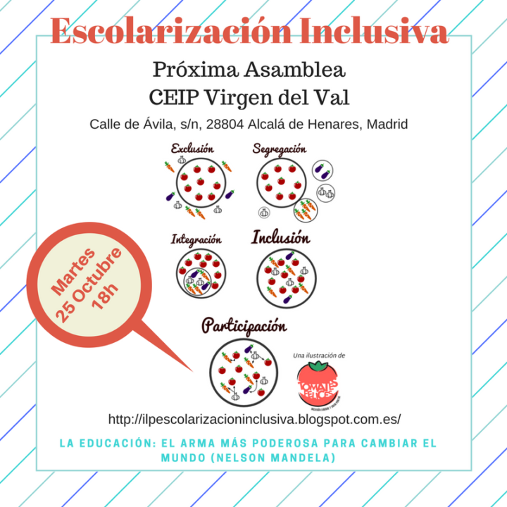 Si ya muchas de nosotras estamos familiarizadas con términos como el de integración educativa omnipresente a nivel curricular, este colectivo formado por familias, profesorado y direcciones de centros entre otros, quiere dar un paso más allá de la integración: hacia la inclusión, ¿qué es escolarización inclusiva? que la diversidad funcional y social se den de la mano en los centros educativos y que nuestras pequeñas vivencien desde lo más natural la presencia en las aulas de toda la amalgama y riqueza que existe en nuestra sociedad, valorando toda la diversidad humana como un elemento imprescindible para el aprendizaje y el desarrollo de nuestras criaturas.