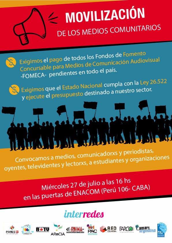 La manifestación será el miércoles a las 16hs en calle Perú 106 (CABA). La jornada está convocada por el espacio Interredes (FARCO, AMARC, RNMA, Red Colmena/CNCT, Red Pac, Red Com, Arecia, Canales comunitarios Pares, Urbana y Barricada TV).