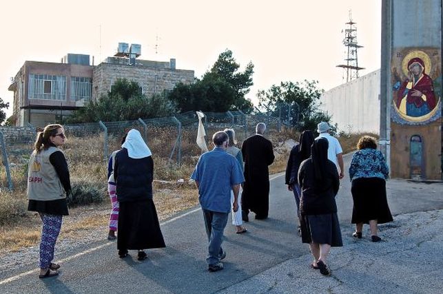 Monjas y voluntarias caminan pausadamente mientras rezan el rosario, recorriendo el pequeño tramo de pared gris que va desde el control militar hasta el lugar donde se encuentra, grabado sobre el hormigón, un brillante icono dorado de una virgen. Un tramo de pocos cientos de metros del llamado por los palestinos «muro de la vergüenza», al ser uno de los grandes símbolos de la ocupación israelí de Cisjordania.