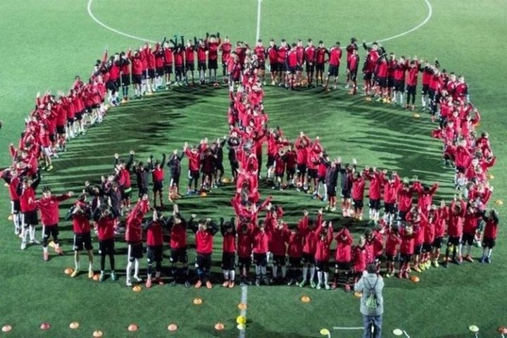 En la Ciudad Deportiva del Rayo Vallecano, en un intermedio en los entrenamientos los jugadores de los equipos juveniles e infantiles del Club realizaron además de los símbolos, las palabras Paz y Noviolencia con sus cuerpos. Más de 300 jugadores con sus cuadros técnicos ayudaron a la realización de las dinámicas.