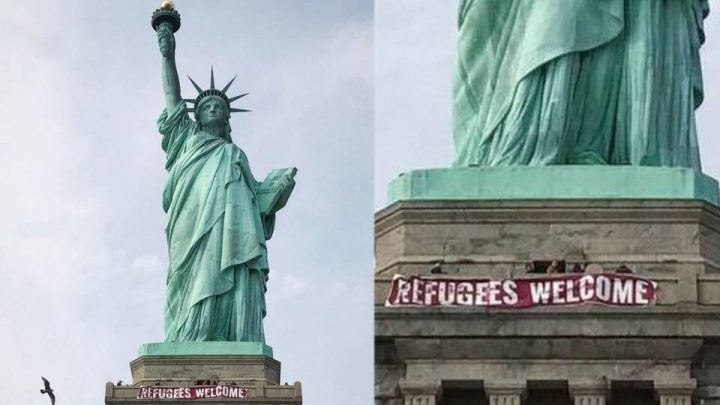 Las duras medidas del gobierno de Trump contra la inmigración y contra los inmigrantes que viven actualmente en Estados Unidos suscitaron protestas generalizadas. Horas después de que el Departamento de Seguridad Nacional presentara sus planes de deportación, activistas desplegaron una pancarta de 1 metro por 6 en la base de la Estatua de la Libertad con la leyenda “Bienvenidos, refugiados”.