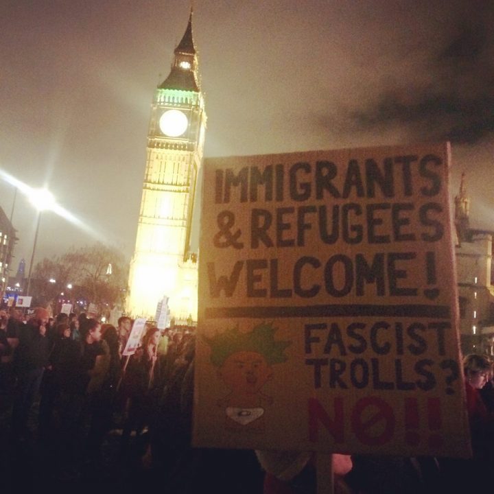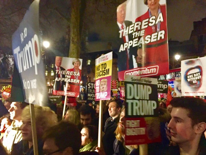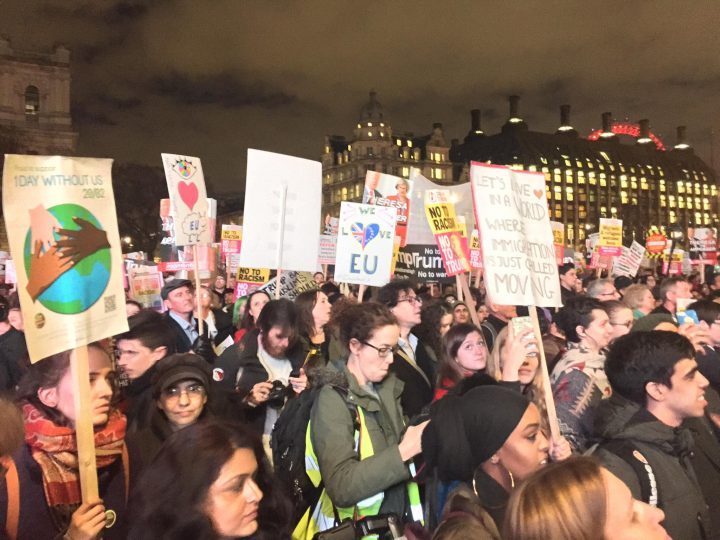 El periodista Owen Jones y la Coalición Detengamos a Trump (Stop Trump Coalition), junto a el movimiento Un Día Sin Nosotros: Protesta Nacional Reino Unido (One Day Without Us: UK National Protest) convocaron a un día de acción a nivel nacional que se realizaría el 20 de febrero, para “ponernos de pie y decirle que no al futuro de odio, racismo y división que Donald Trump está intentando crear, y para decirle que no a la vergonzosa complicidad en la que está cayendo Theresa May y el gobierno británico al apoyarlo”.