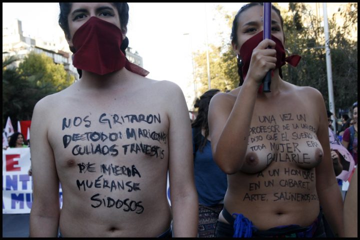 Centenares de miles de mujeres, hombres y niños coparon la más importante avenida del centro de la ciudad de Santiago de Chile para manifestarse por los derechos de estas en el Día Internacional de la Mujer. Las pancartas y gritos denunciaban la falta de protección laboral, el machismo, la injusticia, el acoso y todas las formas de violencia que afectan a las mujeres en el mundo. Diversas organizaciones políticas, gremiales, estudiantiles se manifestaron en un agradable clima familiar, amistoso con artes musicales y estéticos a lo largo de las tres horas que duró esta actividad.