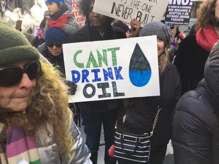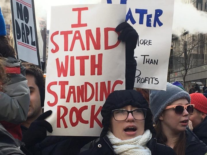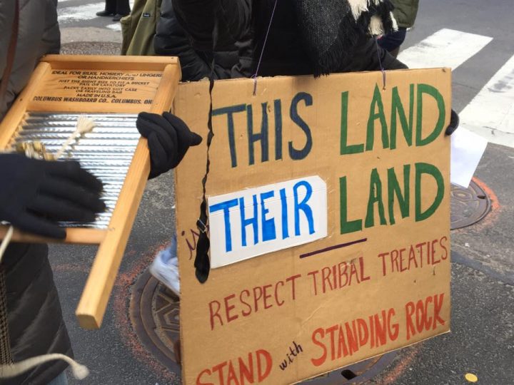 El sábado 4 de marzo, seis días antes de la Marcha de Indígenas en Washington, un grupo de activistas se reunió en frente de la Biblioteca Pública de Nueva York y marchó hasta la Torre Trump para manifestarse en contra del oleoducto Dakota Access y la amenaza que significa para los Sioux de Standing Rock, para sus tierras sagradas y para las aguas.
