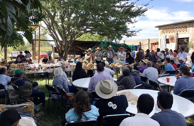 Cerca de 80 pequeños agricultores se reunieron este año en Juanacatlán para compartir historias de éxito en el uso de semillas de herencia, que a menudo han estado en sus familias durante generaciones. El foco fue el maíz, que es un cultivo histórico y sagrado de la cultura rural mexicana, rebajado de precio por las importaciones masivas de maíz subsidiado y genéticamente modificado de los Estados Unidos desde que se firmó el NAFTA en 1994. Después de muchos discursos, los asistentes pasaron varias horas intercambiando estas semillas hereditarias y hablando, compartiendo luego una comida que incluía cerdo asado, frijoles, maíz orgánico y arroz.