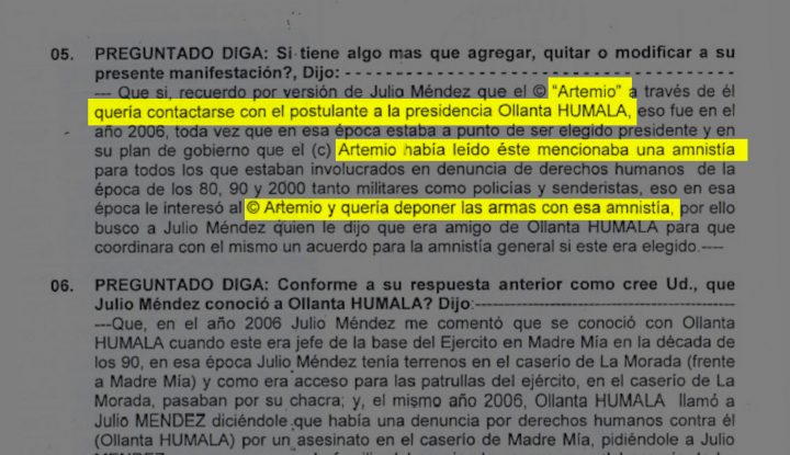 “En esa época estaba a punto de ser elegido presidente y en su plan de gobierno [de Humala] ‘Artemio’ había leído que éste mencionaba una amnistía para todos los que estaban involucrados en denuncias de derechos humanos de la época de los 80, 90 y 2000, tanto militares como policías y senderistas. Eso, en esa época, le interesó a ‘Artemio’ y quería deponer las armas con esa amnistía. Por ello buscó a Julio Méndez, quien le dijo que era amigo de Humala para coordinar con él mismo un acuerdo para la amnistía general si este era elegido”, dijo Gaspar Villar en una declaración desconocida hasta ahora.