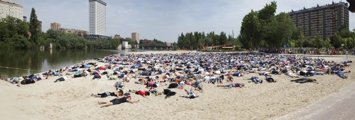 «Fue maravilloso todo el trabajo previo, porque toda la ciudad lo sabía, estábamos dentro del programa oficial del Festival de Teatro de Calle de Valladolid. La ciudad estaba de fiesta, a todo el mundo le acercábamos un folleto. Hicimos una difusión bestial, mucha gente apuntada, con un tono muy alegre, lúdico. Queríamos llegar a los 5000 participantes, pero hacia muchísima calor, a pesar de eso fuimos unas 2500 personas. El tiempo que estuvimos tumbados en la playa fue muy emocionante, hubo gente que se puso a llorar, nos pusimos en la piel… La lectura del Manifiesto la hicieron Nicole, que es congoleña y Taleb, un amigo saharaui que se emocionó mucho, y no pudo acabar de leer, hablando de la gente que había muerto ante la pasividad y complicidad de los gobiernos europeos. Después, entre los árboles, se empezó a tocar percusión. Julio Lázaro, un actor profesional muy implicado en la organización, se debatía en esos momentos entre la vida y la muerte en el hospital. Su hija, desde la playa de las Moreras, le iba contando en directo como se iba sucediendo todo. Él había movido muchos hilos, muy comprometido durante toda la campaña. Julio Lázaro partía dejando un hilo de plata tras de él, una gran acción válida”. La voz de Carmen se entrecorta por la emoción.