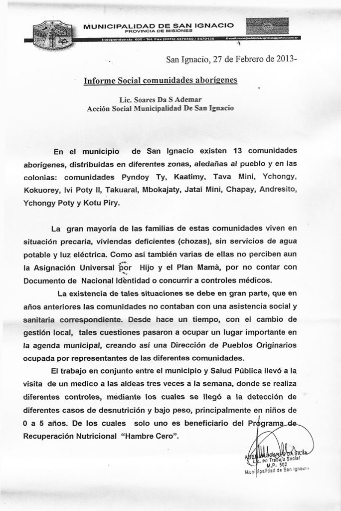 Un informe social sobre Comunidades Aborígenes, documento de la Municipalidad de San Ignacio, con fecha 27 de febrero de 2013 reconoce que “En el municipio de San Ignacio existen 13 comunidades aborígenes, distribuidas en diferentes zonas, aledañas al pueblo y en las colonias: Pindoy Ty, Kaatimy, Tava Mini, Ychongy, Kokuorey, Ivy Poty II, Takuaral, Mbokajatay, Jataí Miní, Chapay, Andresito, Ychongy Poty y Kotu Piry. La gran mayoría de estas familias, viven en situación precaria, viviendas deficientes (chozas), sin servicios de agua potable y luz eléctrica. Así también, varias de ellas no perciben las asignación familiar por hijo, ni el Plan Mamá, por no contar con documento nacional de identidad”.