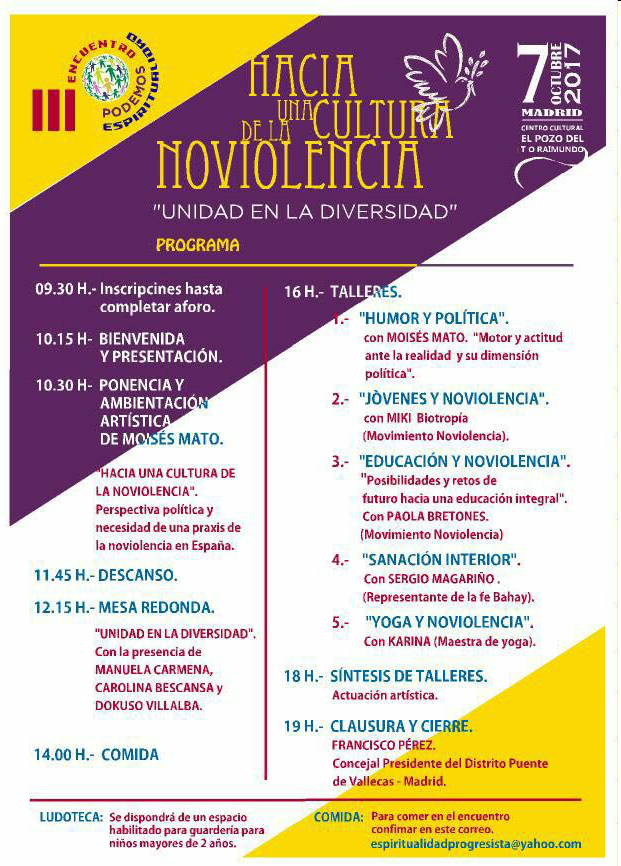 Con el lema ‘ Hacia una cultura de la noviolencia. Unidad en la diversidad’, tendrá lugar el próximo sábado 7 de octubre el III Encuentro anual del Círculo de Espiritualidad de Podemos .
