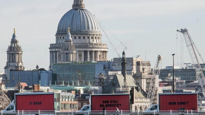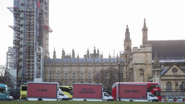 El 15 de febrero de 2018 se exhibieron tres vallas publicitarias en el centro de Londres. Una protesta, inspirada en la película “Tres anuncios en las afueras”, utilizó tres camiones para circular por Londres y realizó importantes paradas en las Casas del Parlamento y la Catedral de San Pablo.