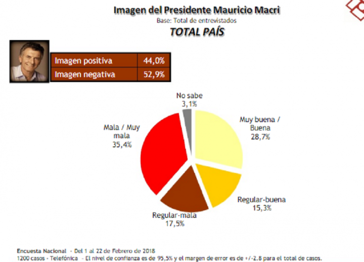 Entre los 1200 encuestados, el 40 % aseguró que votarían por un candidato opositor y casi el 53 % tienen una opinión negativa de su gobierno. Una valoración similar a la evaluada en enero y que muestra que se consolida el descontento generado a fin de año por el recorte jubilatorio, de ayudas sociales y  la fuerte represión vivida en las calles de Buenos Aires.