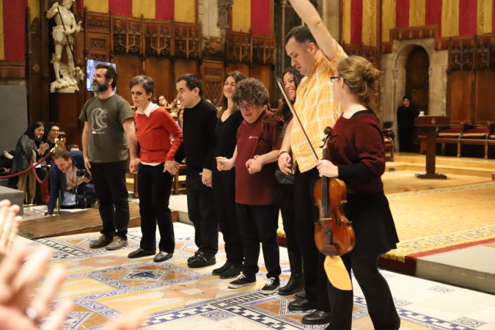 El acto, en un salón lleno de representantes de diferentes partidos políticos y de las diferentes entidades, ha sido abierto por un pequeño espectáculo musical llevado a cabo por un grupo compuesto de algunas personas con diversidad funcional, organizado por la entidad ARTtransforma, que utiliza el arte como instrumentos de inclusión social.