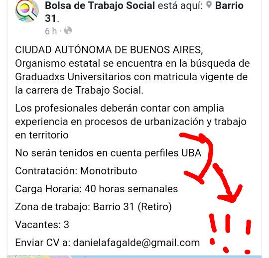 “La Facultad de Ciencias Sociales de la Universidad de Buenos Aires manifiesta su más enérgico repudio a la oferta laboral que trascendió en nombre del Gobierno de la Ciudad de Buenos Aires, en la que se explicita la exclusión de trabajadores/as sociales con “perfiles UBA”.