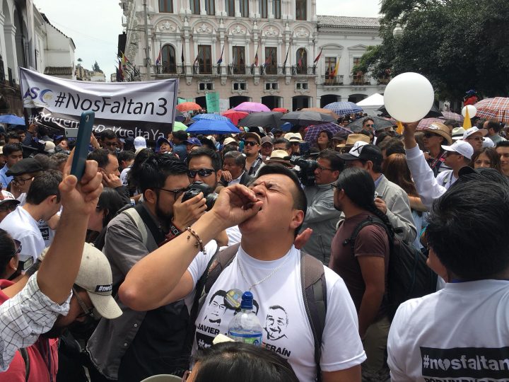 Ya nos adentrábamos al centro histórico por la extensa calle Guayaquil mientras la acústica de las casas hacía que se escuche con más fuerza “Moreno escucha, la FACSO está en la lucha”; y finalmente, la Plaza Grande se abría entre nosotros, no existía en ese momento ni tráfico, ni agentes de tránsito ni policía que nos impidiera llegar a nuestro destino. Y ya cuando nos ubicamos frente el “Palacio de Carondelet” junto a familiares de los secuestrados, trabajadores del Diario El Comercio, estudiantes de otras universidades, fotógrafos, camarógrafos, reporteros y más, el último canto anunciaba nuestra llegada “Adelante, adelante, adelante universidad. En el tiempo, en el espacio, tu nombre sonará. Universidad, U, Universidad, U… Central.”
