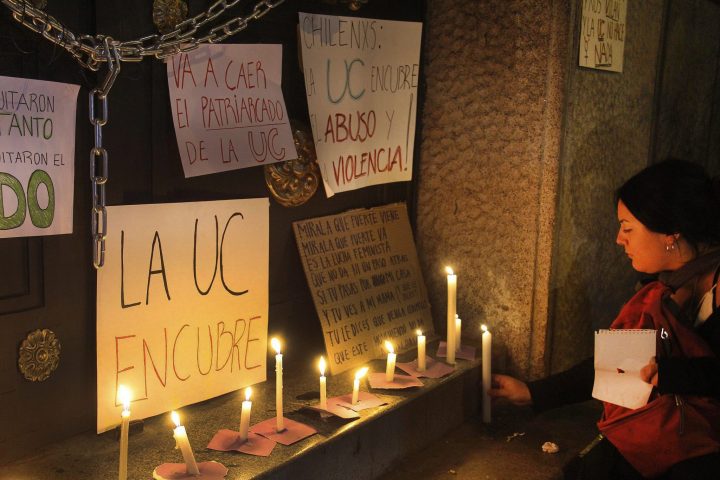Alrededor de unas cien estudiantes mujeres se tomaron la casa central de la Universidad Católica: una toma inédita, una toma feminista. Su petitorio es claro; no a la discriminación, no a la educación sexista, respeto a las diversidades entre otras cosas y en el frontis de ese imponente edificio iluminado con la tenue llama de las velas, manos de mujeres se unen formando un cordón humano de extremo a extremo, como diciendo las apoyamos compañeras, estamos con ustedes, valentía chiquillas, porque no es fácil tomarse la casa central de la UC, solo tres veces en 50 años los estudiantes han cerrado sus puertas, en los años 1967 y 1986 y éste , una toma inédita, el rector se ha comprometido a no desalojar pero los estudiantes de derecho ( y de derechas) ya ingresaron a la toma y están allí , las feministas por un lado y los gremialistas por otro. Las feministas son más, tienen apoyo y su toma es pacífica, simbólica como le escuché decir a una estudiante entre bailes, cantos y los gritos que electrizaban el frontis de la casa central de la UC.
