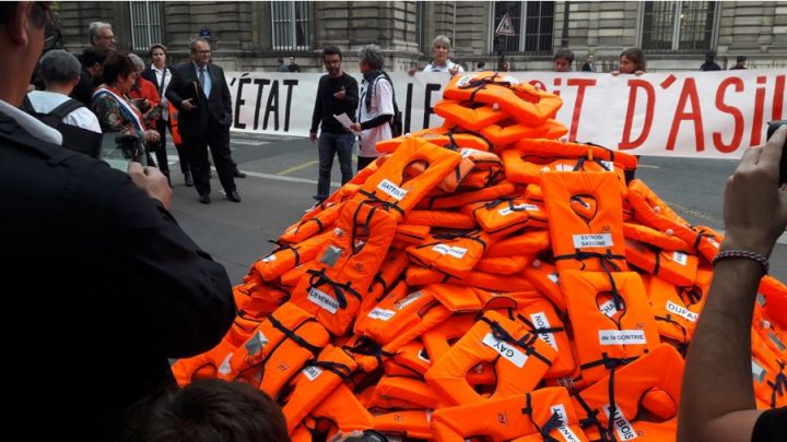 No es la primera acción del «Collectif Accueil de Merde«. Pero éste tiene la particularidad de comprometer casi personalmente a los representantes electos, cada uno de los cuales tiene una responsabilidad en el estudio de la ley de asilo-inmigración que actualmente hace correr mucha tinta. Además, una vez desenrollada la pancarta «EL ESTADO ANULA EL DERECHO DE ASILO» y alineadas las camisetas, algunos senadores se presentan frente a la pila y se ponen el chaleco salvavidas que les pertenece. Al hacerlo, asumen su responsabilidad en la revisión del texto. Pero, lamentablemente, son muy pocos los que asumen estas responsabilidades esta mañana. ¿Cuándo dejará el gobierno de matar indirectamente a seres humanos ahogando el derecho de asilo?
