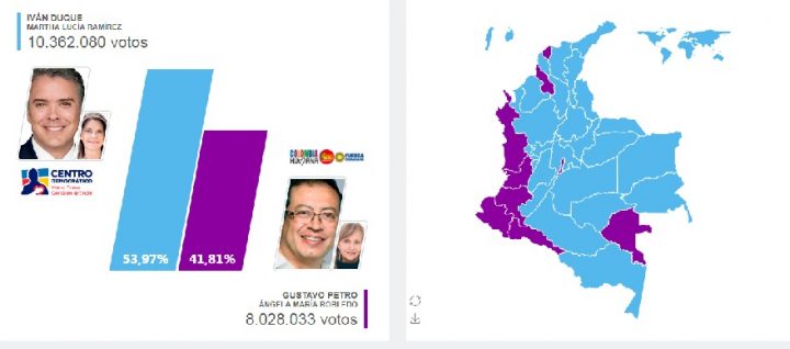 El derechista Iván Duque será el próximo presidente de Colombia, tras vencer en la segunda vuelta electoral al candidato centroizquierdista Gustavo Petro, con casi 54% de los votos y una diferencia de más de 12% sobre su oponente, en comicios en los que participaron apenas la mitad de los ciudadanos.